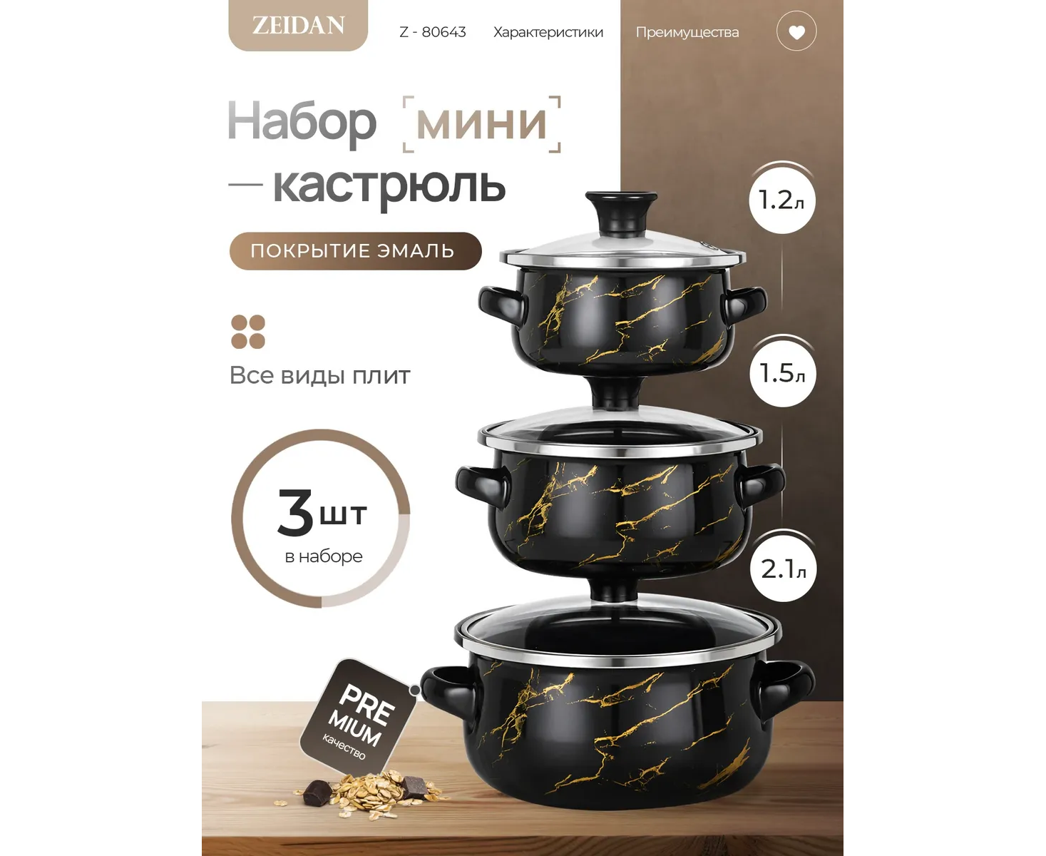 Набор кастрюль Zeidan Z-80643 Naft 6 предмето 3 кастрюли с крышками