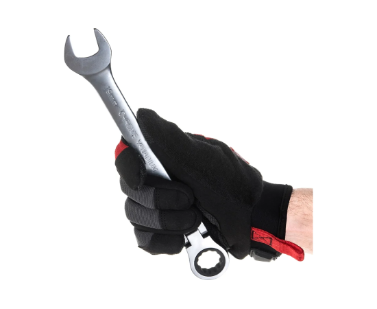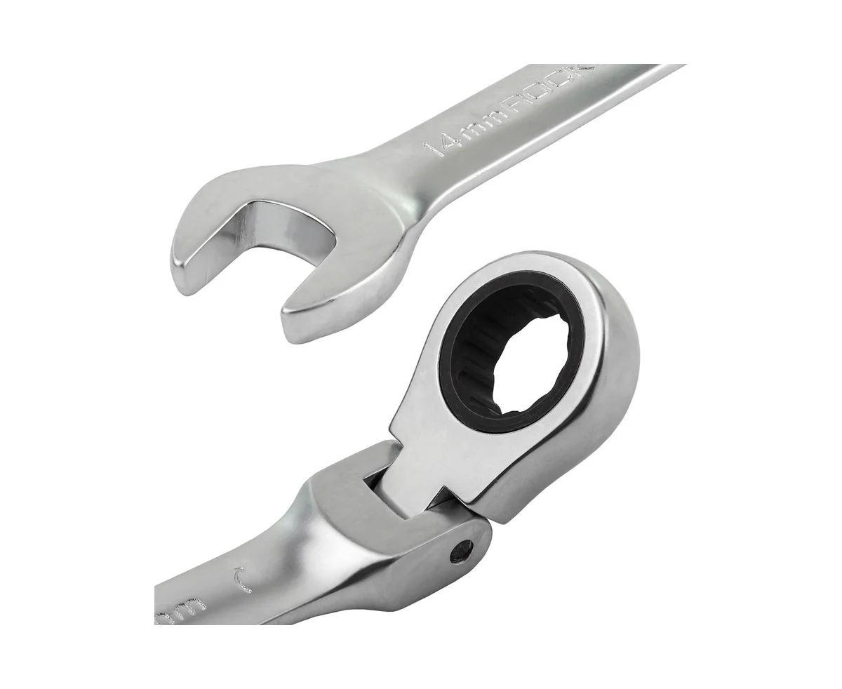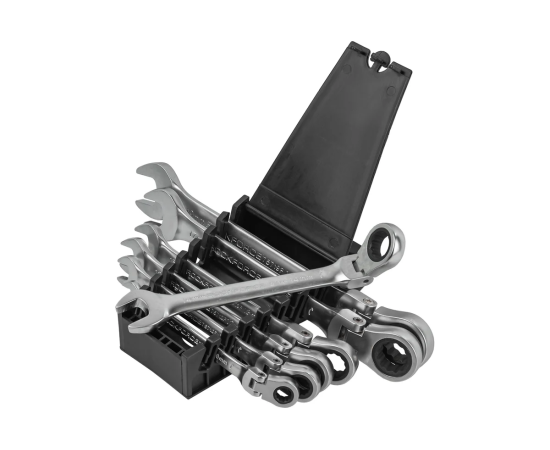 Накидная сторона ключей обеспечивает надежное сцепление и позволяет легко закручивать и выкручивать элементы. Трещоточный механизм увеличивает скорость работы, так как не требует постоянного переставления ключа.