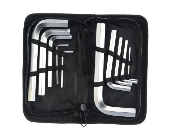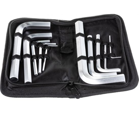 Набор имбусовых коротких ключей предназначен для работы с различным крепежом, головка которого имеет углубление в виде шестигранника. Набор включает в себя 10 ключей размером от 2 до 14 мм. Для удобства хранения и транспортировки набор поставляется в нейлоновом чехле.