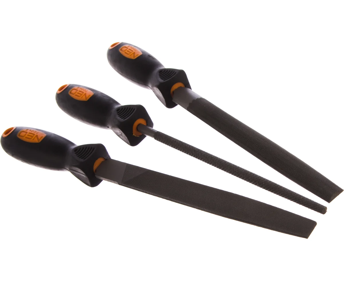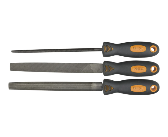 Напильники по металлу NEO 3 шт. 37-605 используются для шлифовальных работ по металлу. В комплект входят напильники с плоским, полукруглым и круглым сечением. Изделия изготовлены из легированной стали T12, обладающей повышенной твердостью. Удобные рукоятки покрыты материалом TPR для более комфортного захвата.