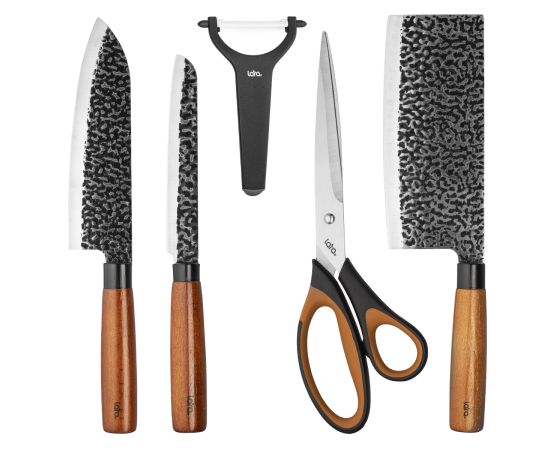 Набор ножей LARA LR05-11 5 предметов, топорик, нож сантоку, нож универс. овощечистка, ножницы, 3CR14