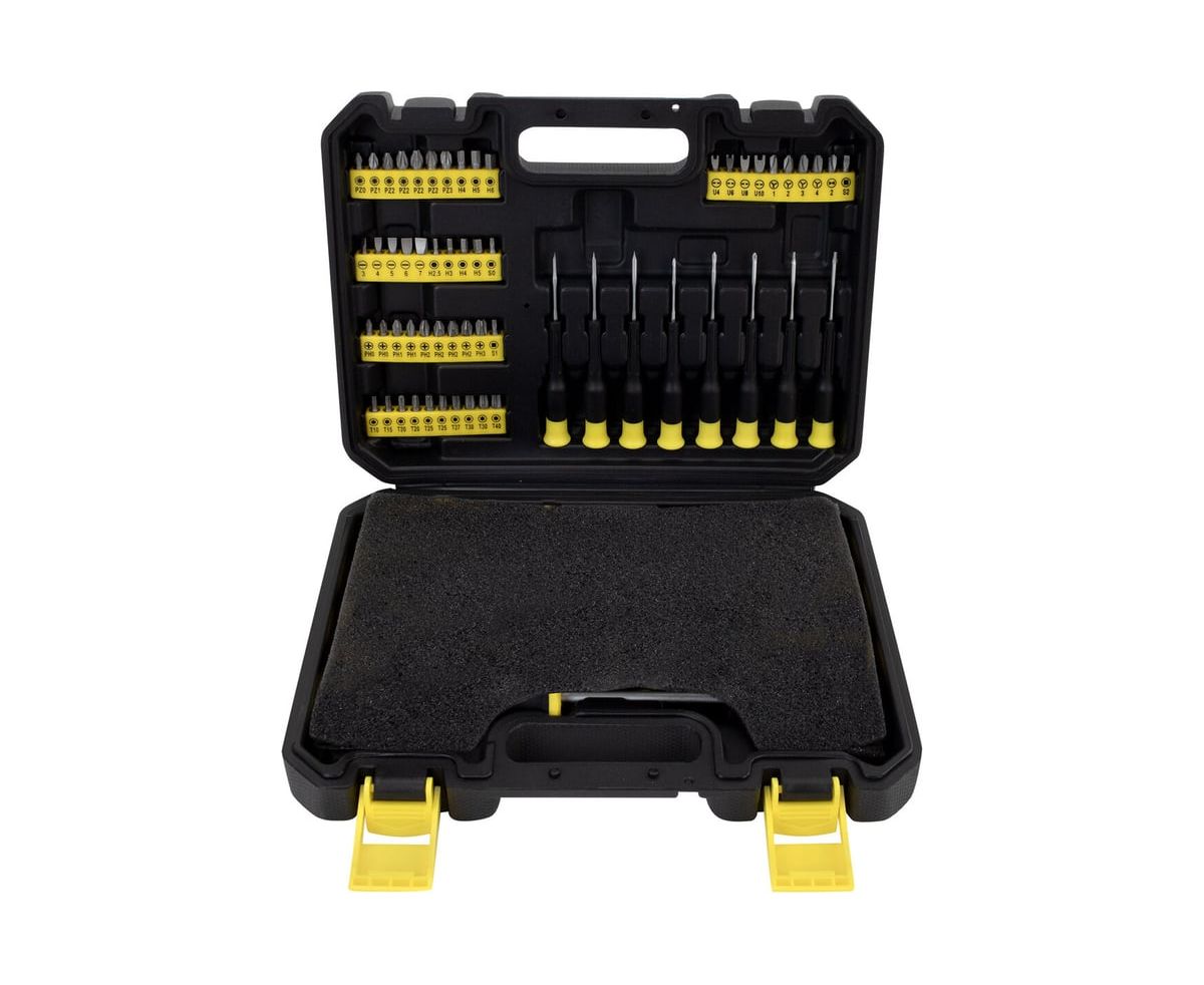 Инструменты размещены в ударопрочном кейсе с двумя застёжками и ручкой для удобной переноски. Каждый элемент прочно зафиксирован внутри и не выпадает при транспортировке.