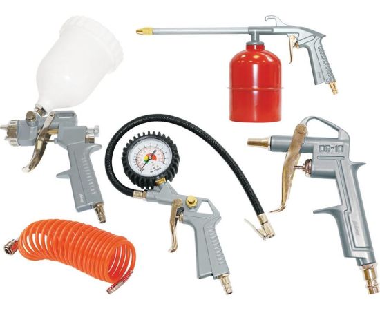 В комплект набора входят: краскораспылитель с верхним бачком объемом 0,6 л, пневмопистолет для вязких жидкостей с бачком 0,85 л, пневмопистолет для продувки, пневмопистолет для накачки шин с манометром, спиральный шланг 5м.