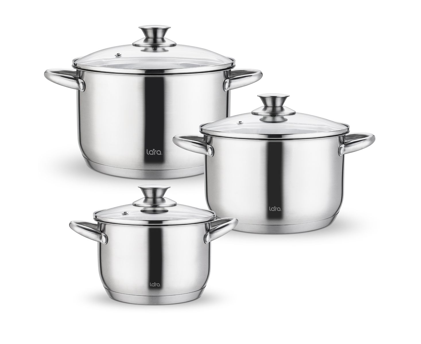 В комплекте 3 кастрюли: 2.1 л, 3.9 л, 6.5 л; 3 крышки
