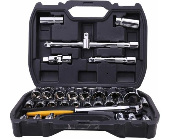 Набор торцевых головок и ключей DELI dl1032 1/2", муфты из стали 50bv30 Cr-V, высококачественная пластиковая коробка, 32 шт. 104461 предназначен для проведения различных ремонтных и монтажных работ в сфере авторемонта, ремонта велосипедов и мотоциклов и др. Инструменты набора выполнены из высококачественной хромованадиевой стали, что обеспечивает прочность и долговечность. Хромированное покрытие обеспечивает защиту от коррозии. Набор поставляется в прочном пластиковом кейсе для удобного хранения и транспортировки.