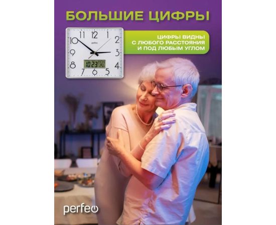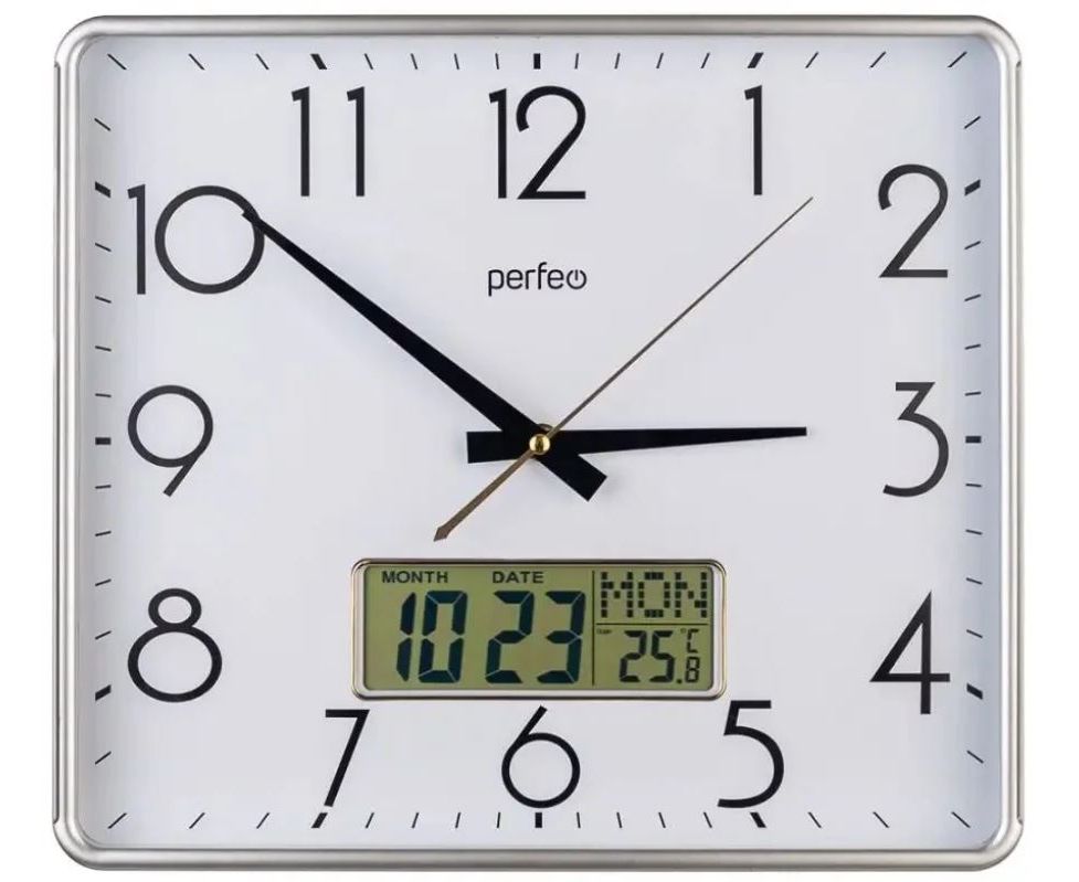 Настенные часы Perfeo "PF-WC-016", прямоугольные 34*30 см, серебряный корпус / белый циферблат