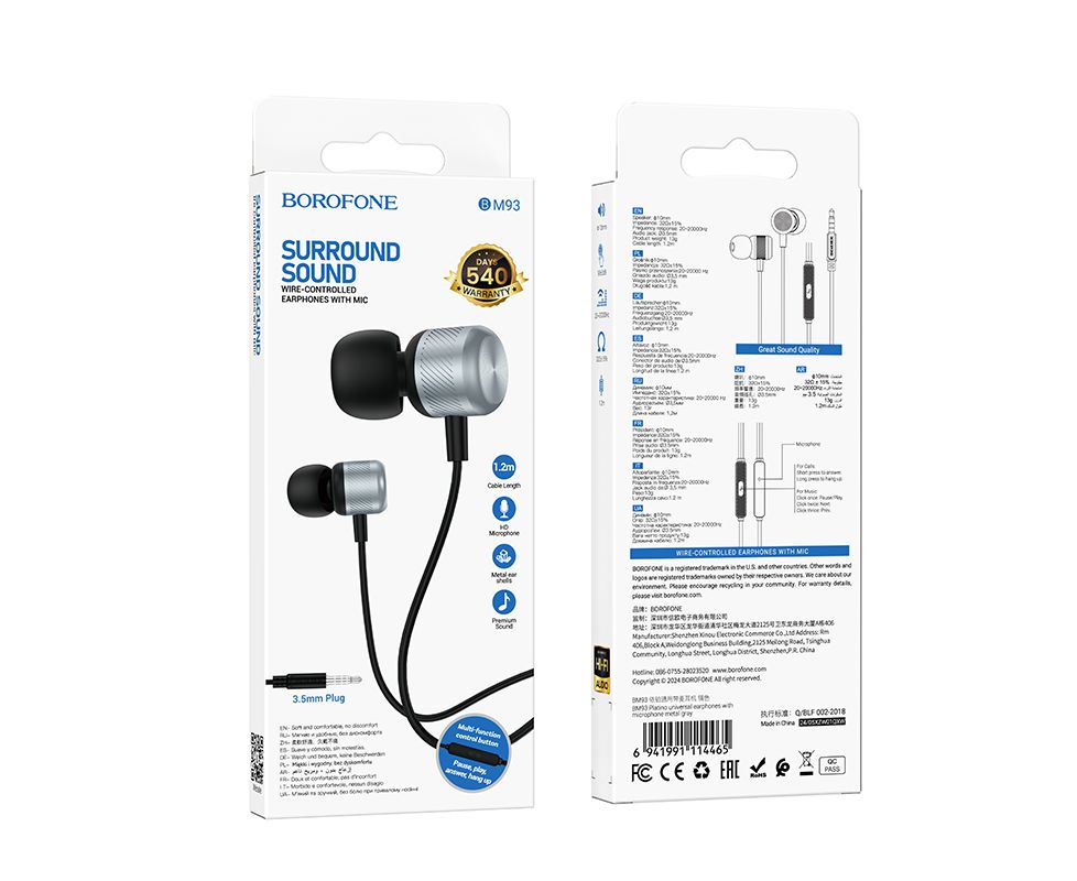 Наушники BOROFONE BM93 Platino universal earphones with microphone (серый)