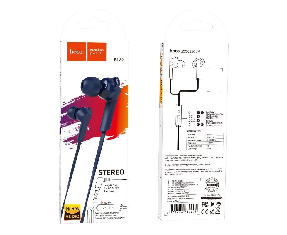 Наушники HOCO M72 Admire universal earphones with mic (синий)