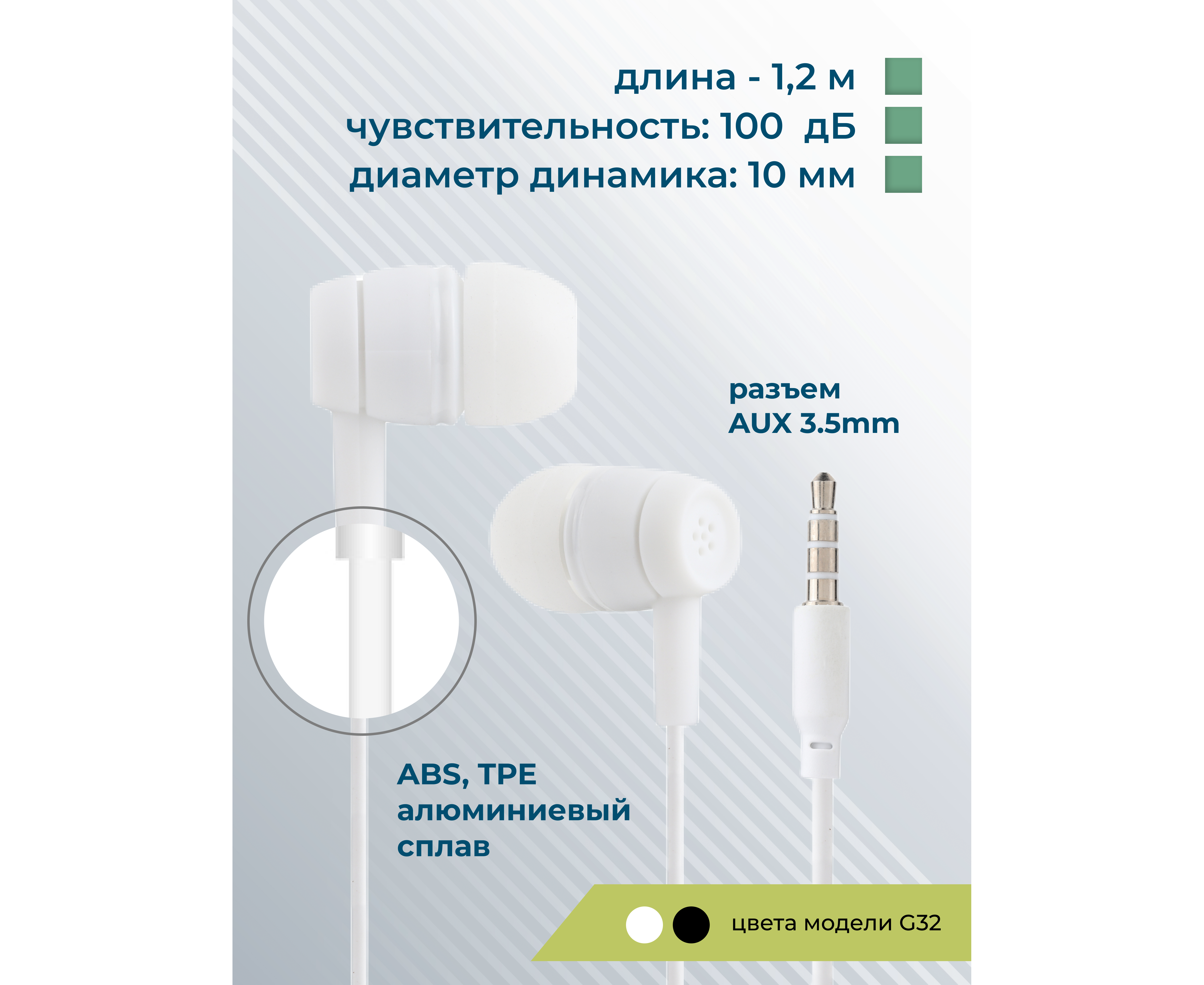 Материал: ABS-пластик, TPE, алюминиевый сплав Тип наушников: вакуумные, проводные Динамик: 10 мм Разъём: miniJack 3,5 мм Длина кабеля: 1,2 м Пульт ДУ: микрофон, старт/пауза, ответ на звонок Комплектация: наушники, сменные амбушюры, две пылезащитные заглушки для разъема AUX, кольцо-держатель для смартфона, буклет. Цвета: Black, White