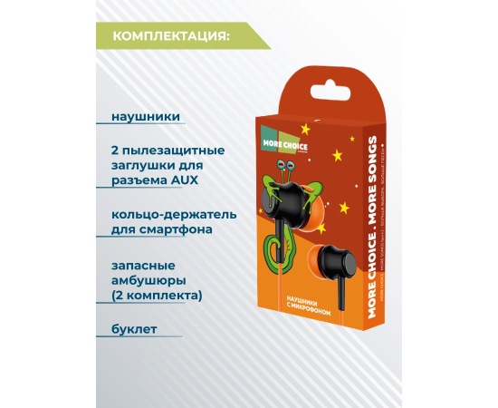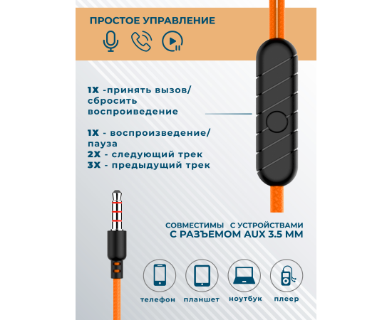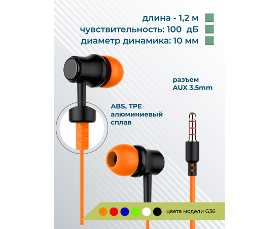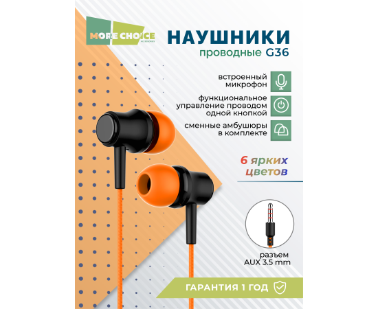 Наушники вакуумные AUX разъём с МК без рег.громкости длина 1.2м More Choice G36 (Orange)