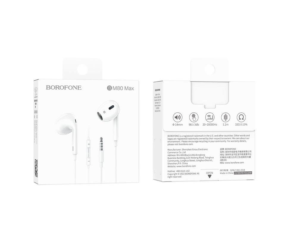Наушники вкладыши AUX разъём с МК и рег.громкости длина 1.2м Borofone BM80 Max Gorgeous (White)