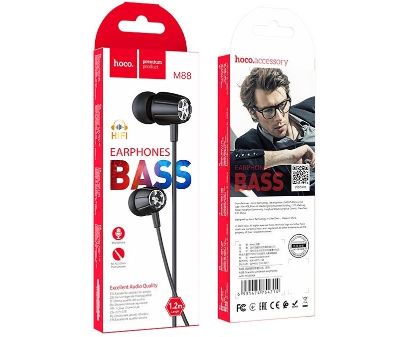 Наушники вкладыши для AUX разъёма с микрофоном длина 1.2м Hoco M88 (Black)