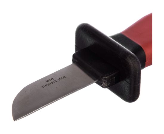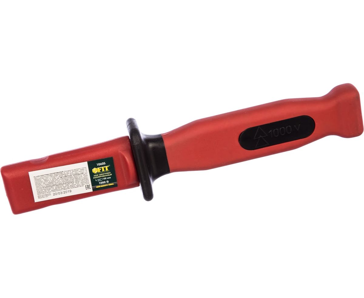 Изолированный нож FIT 1000 В, нерж.сталь, лезвие 50мм, прорезин.ручка 10605 служит для зачистки изоляционной оболочки проводов и кабелей. Изделие защищает пользователя от поражения электрическим током при выполнении работ на установках под напряжением до 1000В переменного тока и до 1500В - постоянного тока. Лезвие ножа изготовлено из нержавеющей стали, рукоятка выполнена из пластика и имеет обрезиненную поверхностность. Пластиковые ножны защищают лезвие при хранении и транспортировке.