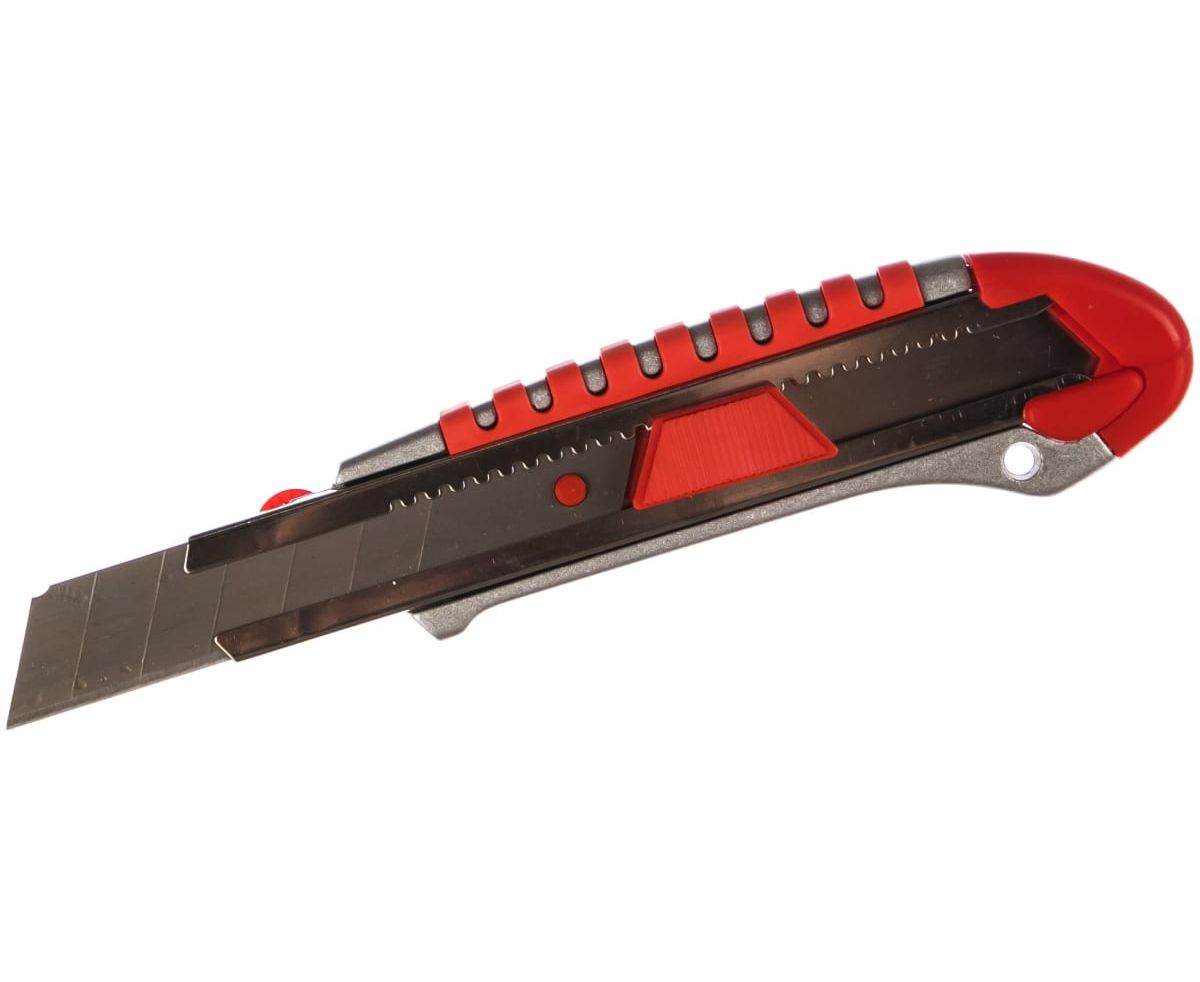 Прочный металлический корпус инструмента обладает удобной обрезиненной рукояткой, что увеличивает его эксплуатационные свойства. Стальное лезвие фиксируется автоматически, также предусмотрен дополнительный замок. Когда крайний сегмент затупляется, его можно отломить и продолжить использование инструмента Качественные материалы обеспечивают долговечное использование.