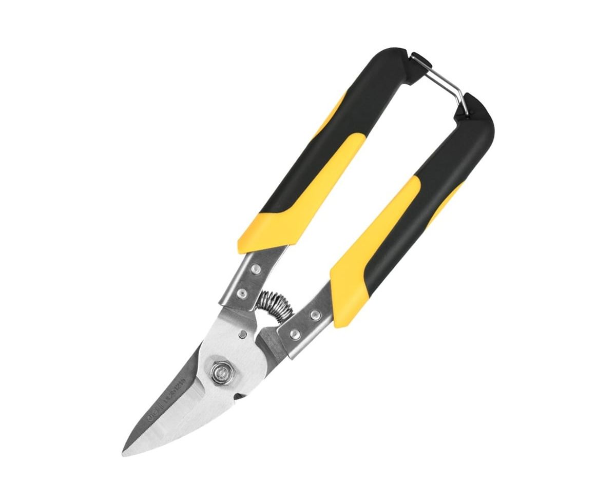 Фиксатор рукояток позволяет надежно фиксировать ножницы в закрытом состоянии, что удобно для хранения и транспортировки, а также обеспечивает безопасность при использовании.