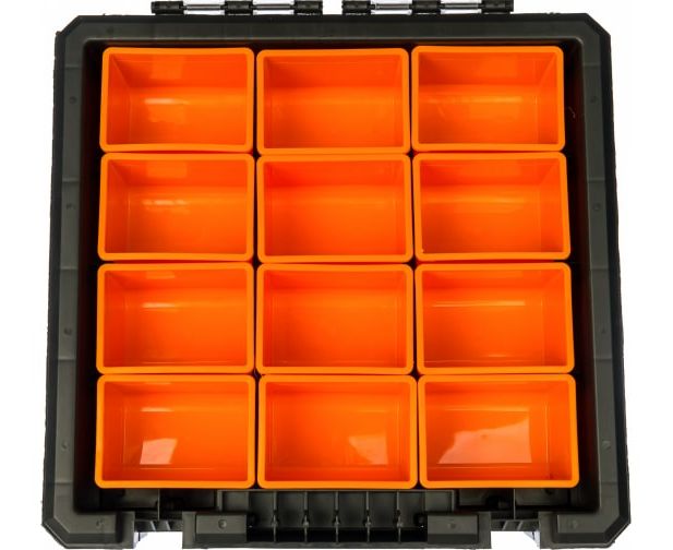 Органайзер с отделениями, 40x40x12см NEO 84-130 - универсальное приспособление для мастерской или гаража. Модель изготовлена из пластмассы и металла и оснащается противоударными уголками, что обеспечивает надежность во время транспортировки. Алюминиевые замки препятствуют случайному выпаданию крепежа во время транспортировки. Крышка органайзера выполнена из поликарбоната.