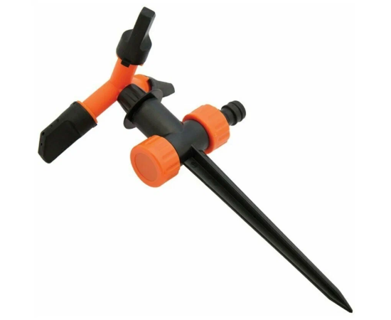 Ороситель вращается и поливает территорию по кругу. Можно настроить его на секторный режим полива.