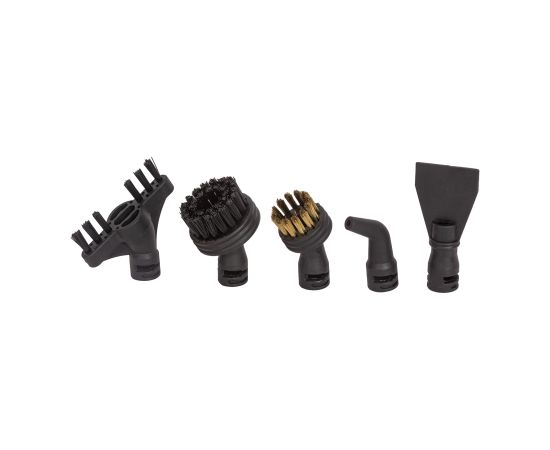 швабра, мерный стакан, воронка, насадка для очистки ковров, насадка из микрофибры для очистки пола, конусная насадка, металлическая щетка, нейлоновая щетка, насадка скребок, изогнутая насадка, насадка-щетка для очистки межплиточных швов, насадка для отпаривания, микрофибра для отпаривания, дополнительная щетка для отпаривания, насадка для окон, инструкция на русском языке
