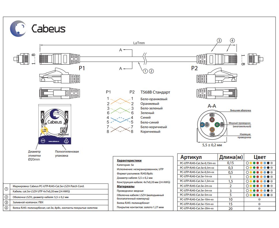 Диаметр кабеля: 5,5 мм ± 0,2 мм