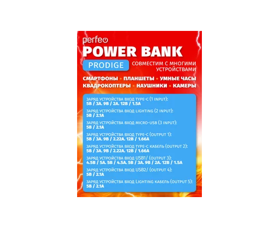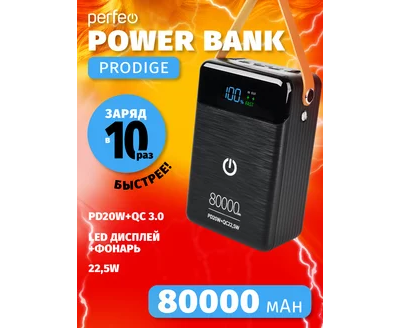 Повербанк Perfeo PRODIGE 80000 mAh/LED/PD + QC 3.0/Type-C/Lightning/3 USB/Выход: 5A, max 22.5W, черный