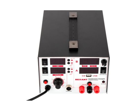 Паяльная станция оснащена термофеном, паяльником и источником питания. Все три функции автономны и могут работать независимо друг от друга. Дополнительная опция USB разъем обеспечивает соединение станции с другим оборудованием.