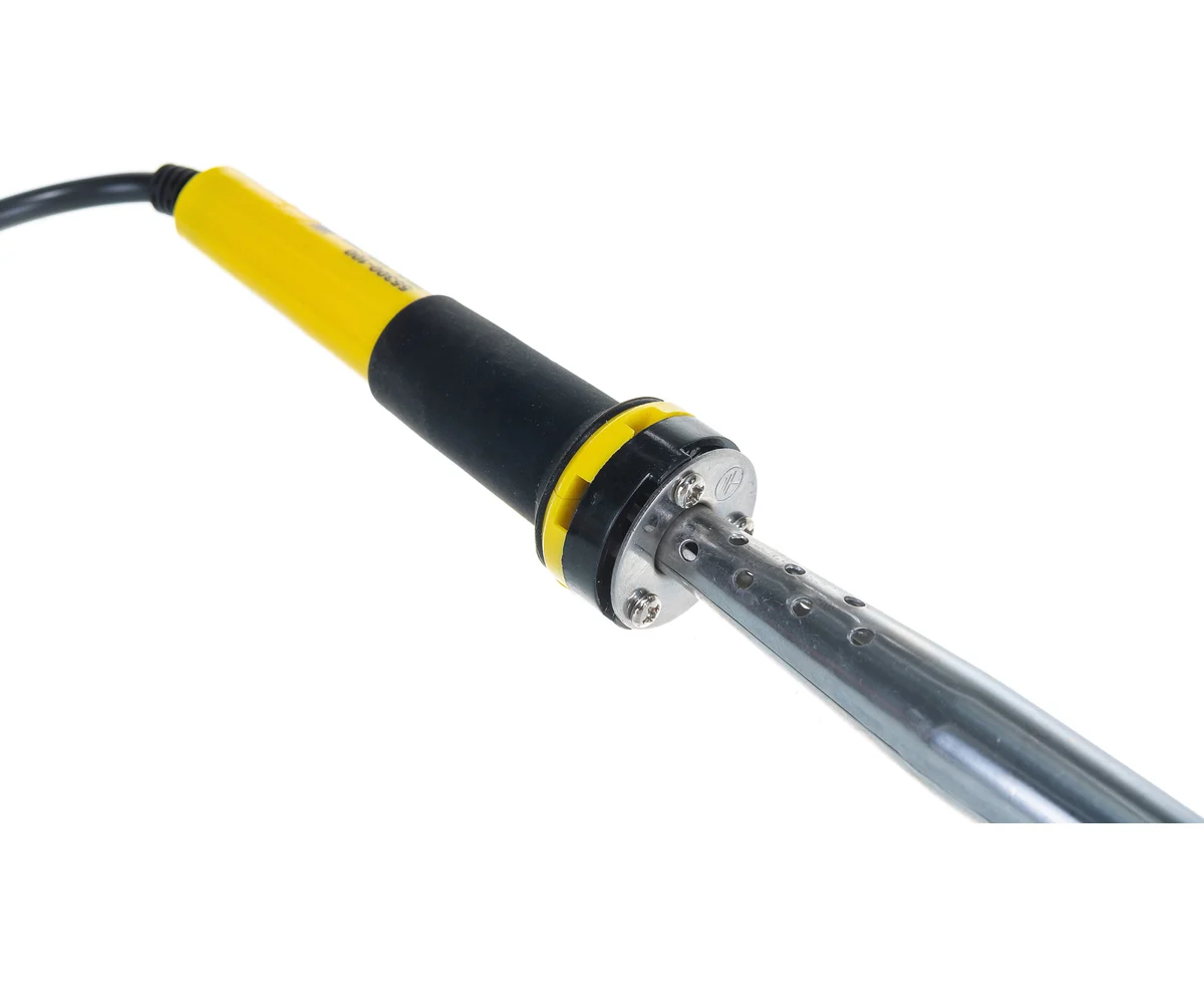 Паяльник с двухкомпонентной рукояткой и долговечным жалом, в комплекте припой и подставка, 100Вт, клин STAYER PROFI 55300-100 - надежный и долговечный электрический прибор, выполненный из высококачественных современных материалов, который служит для напаивания электронных компонентов на печатную плату, пайки и лужения медных проводников, а также отпайки различных деталей.