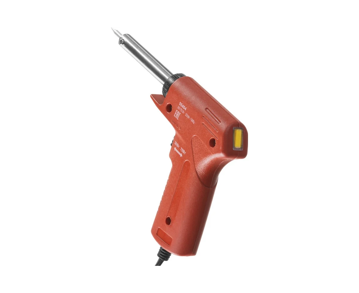 Электропаяльник ЗУБР пистолетного типа 30-70Вт конус 55404 обеспечивает легкую и качественную пайку различных деталей. Имеет медное жало со специальным защитным покрытием. Ручка паяльника выполнена в форме пистоле и удобна в обхвате. Изделие изготовлено с использованием современных материалов, обладает высокой надежностью и продолжительным рабочим ресурсом.