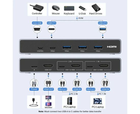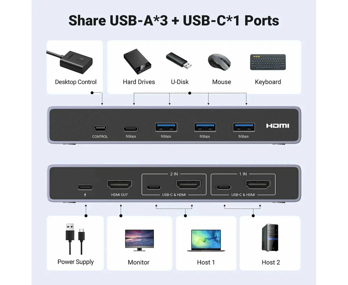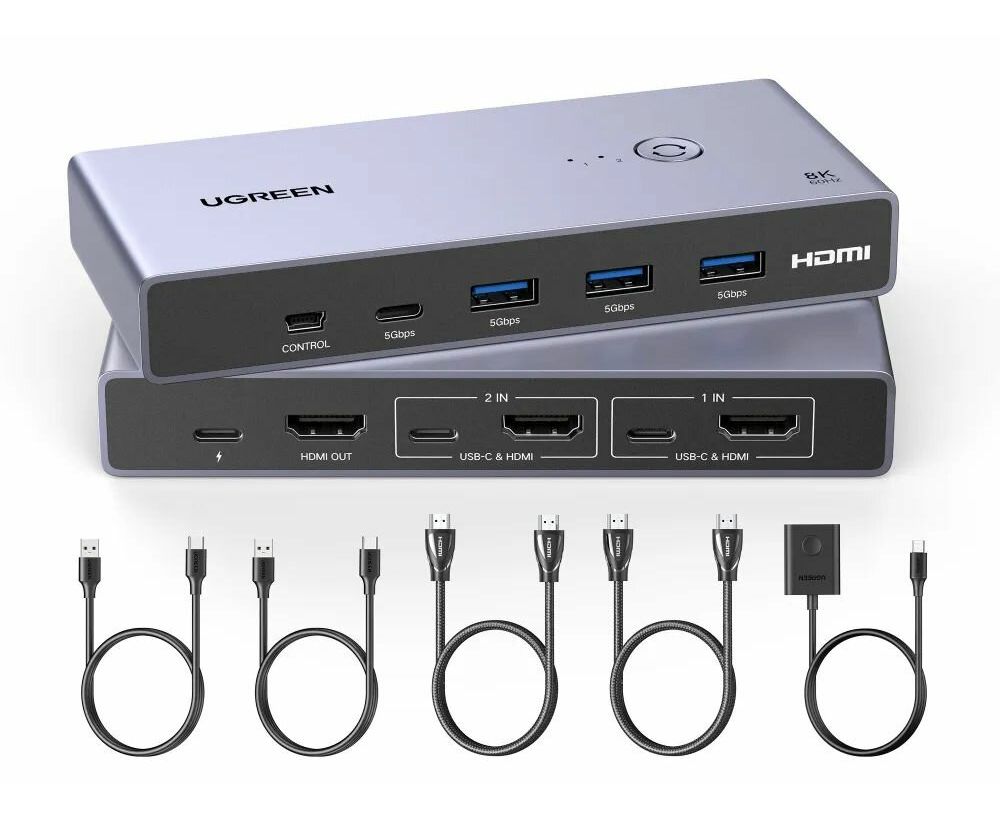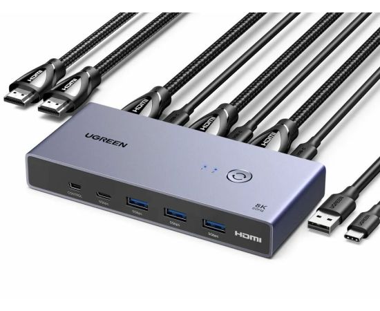 Переключатель UGREEN CM692 (25961) 8K@60Hz HDMI 2.1 KVM Switch 2-in-1 Out With Desktop Controller Gray