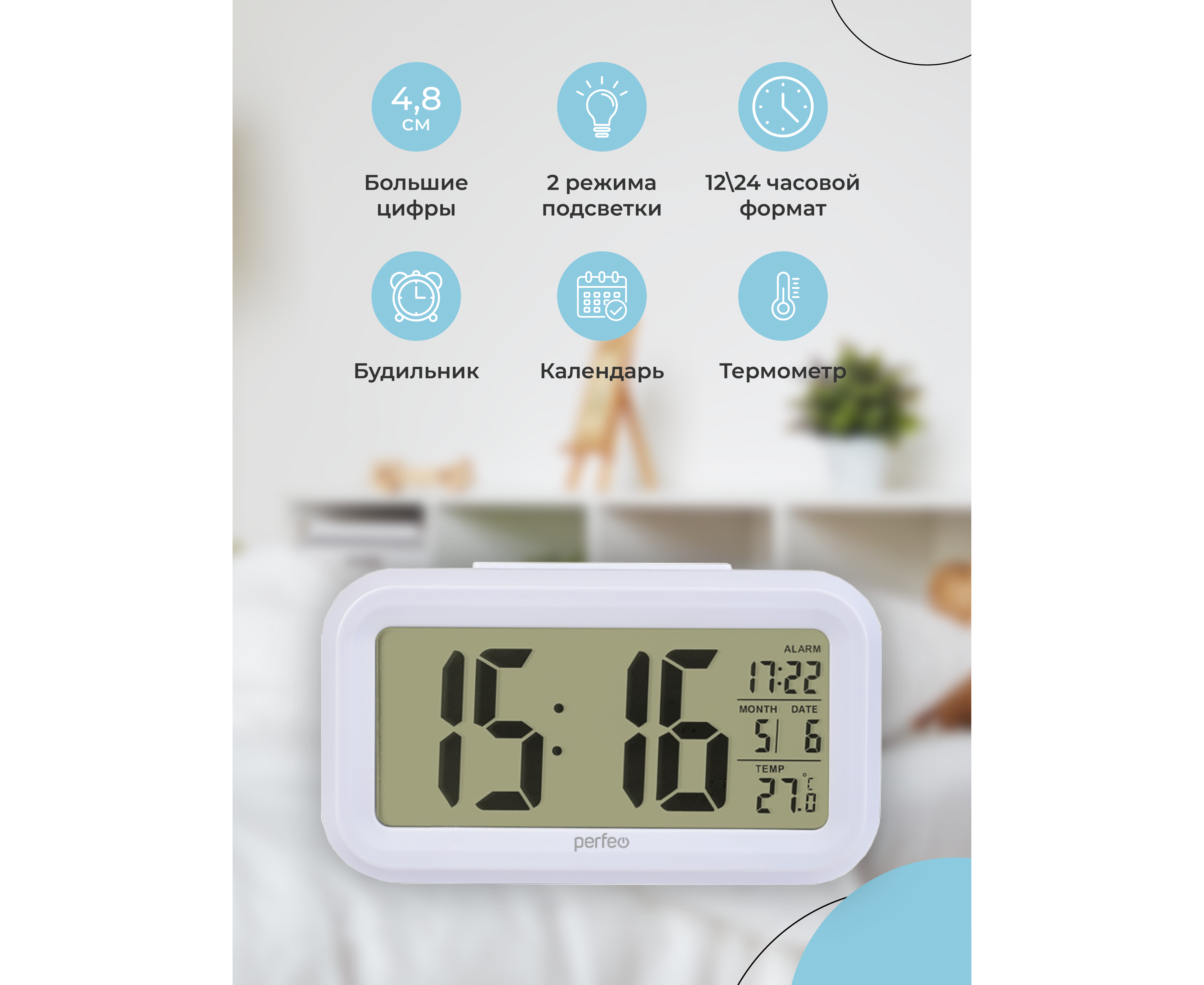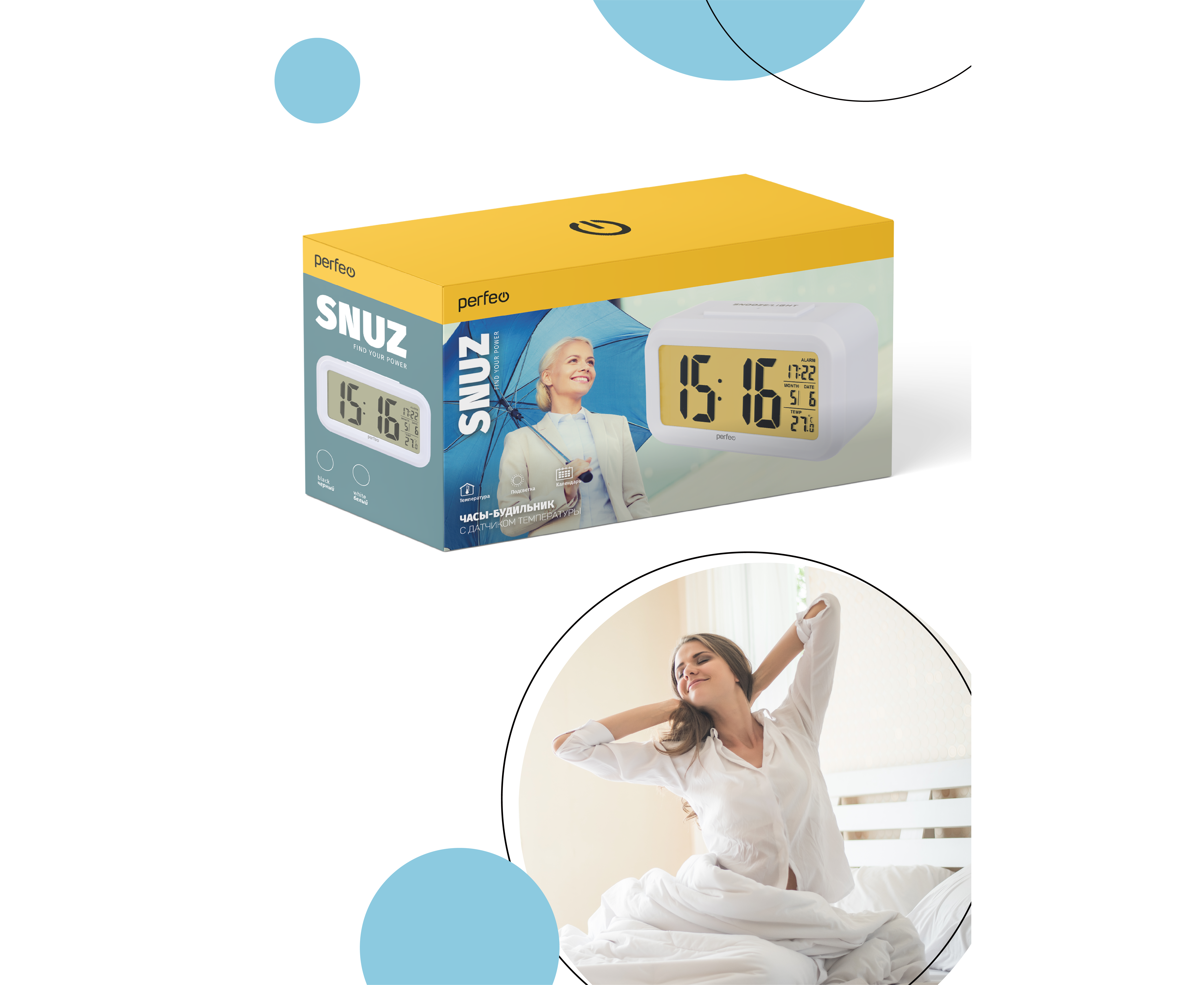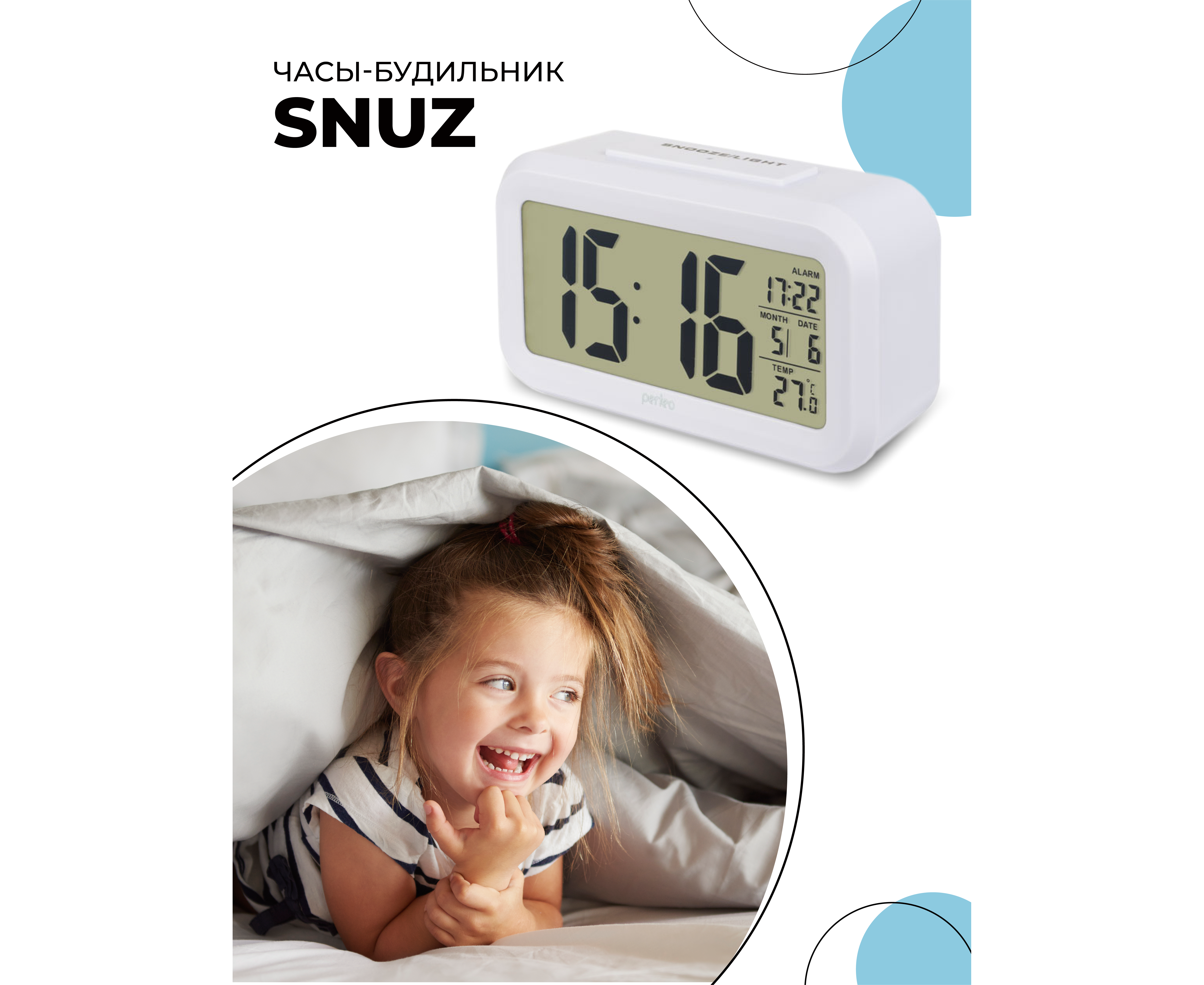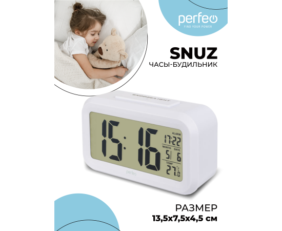 Часы-будильник Perfeo "Snuz", (PF-S2166) время, температура, дата, белые, (Арт. PF_A4848)