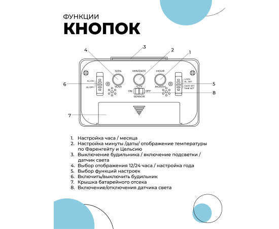 Представляем Вам уникальные электронные настольные часы с будильником! Эти стильные и удобные часы будут идеальным спутником в вашей повседневной жизни. Они подарят вам не только точное отображение времени, но и множество дополнительных функций. Будильником настольные часы обеспечивают надежное и своевременное пробуждение каждое утро. Настройте будильник на нужное время и наслаждайтесь спокойным утром без бесконечных пробуждений. Благодаря электронной системе управления, прерванный сон больше никогда не будет проблемой. Белый цвет и стильный дизайн делают эти настольные часы идеальным дополнением для любого интерьера. Они прекрасно впишутся в любое помещение, будь то спальня, офис или гостинная. Благодаря небольшим размерам, их удобно разместить на столе или прикроватной тумбочке. Одной из ключевых особенностей этих часов является уникальная подсветка. В часах реализовано два вида подсветки: стандартная и «тлеющая». Стандартная подсветка активируется нажатием на клавишу (3) вверху часов. Уникальная «тлеющая» подсветка активизируется в полной темноте при включенном переключателе сенсора подсветки (8). Приполном отсутствии света часы автоматически активируют мягкую ночную подсветку. Она достаточно яркая, что бы разглядеть время, но приглушенная, что бы не мешать сну. Электронные часы также оснащены гигрометром и термометром. Они позволяют отслеживать температуру и влажность в помещении. Благодаря этим функциям вы всегда будете знать, как создать оптимальный микроклимат для комфорта и здоровья. Часы работают от 3х батареек типа ААА, что обеспечивает долгий срок службы без необходимости замены их слишком часто. Это позволяет вам быть уверенными в их надежности и стабильной работе. Наши электронные часы идеально подходят для подарка мужчинам на 23 февраля, женщинам на 8 марта или просто, для хорошего повода, подарка на день рождения. Важно: Если не установлена третья (верхняя) батарейка, то подсветки не будет!