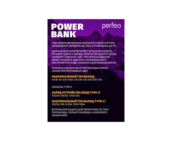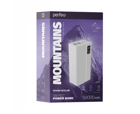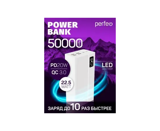 Пауэрбанк Perfeo MOUNTAINS 50000 mAh/LED дисплей/PD + QC 3.0/Type-C/4 USB/Выход: 3A, max 22.5W/белый
