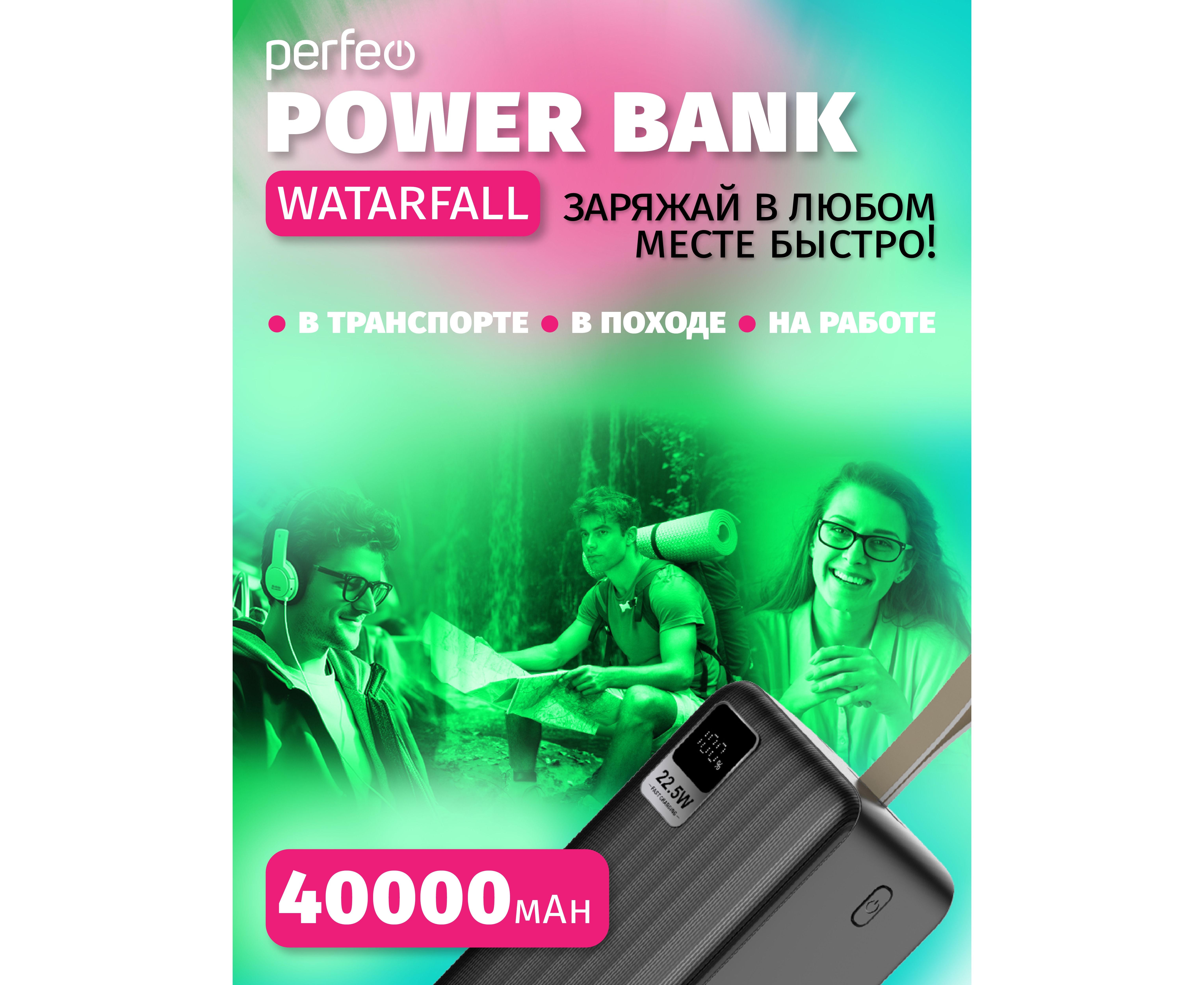 Повербанк Perfeo Powerbank 40000 mAh/LED дисплей/PD + QC 3.0/Type-C/2 USB/Выход: 5A, max 22.5W/черный