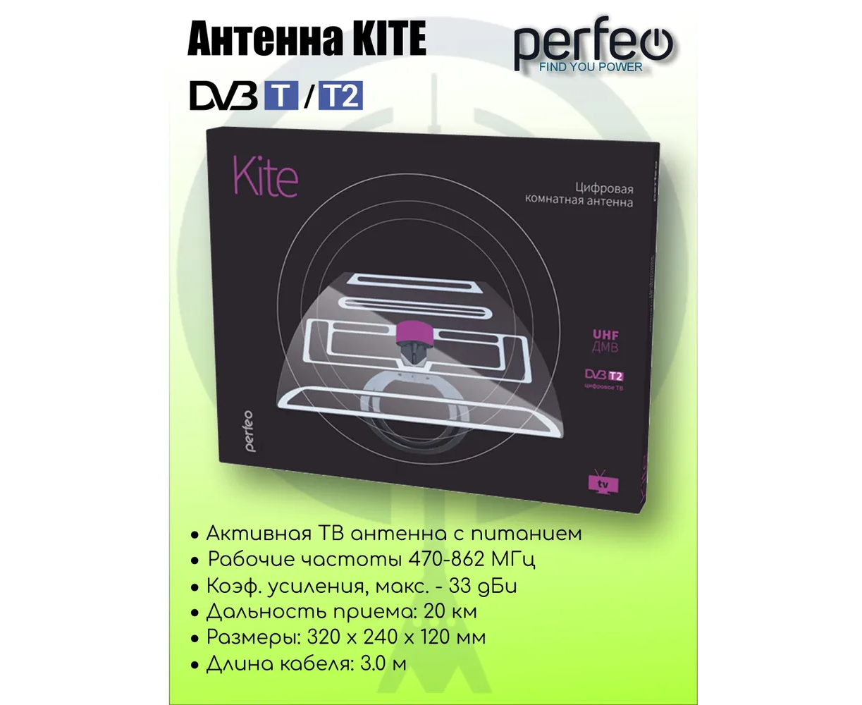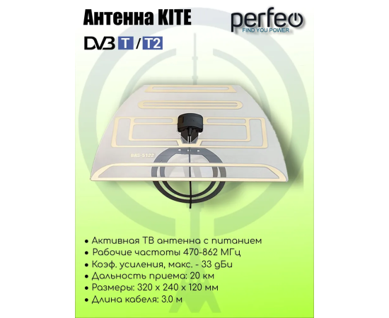 Антенна ТВ Perfeo "KITE", активная, встр. усилитель, питание от ресивера 5V, DVB-T2 (BAS-5122), (Арт. PF_A4210)