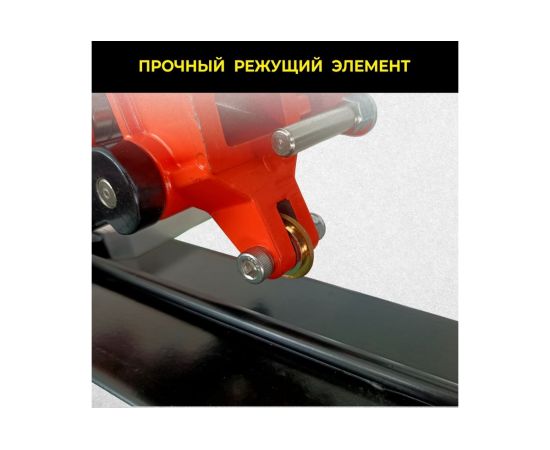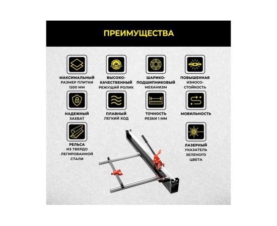 Ручной плиткорез предназначен для раскроя керамической плитки и керамогранита. Он позволяет работать с плиткой малого, среднего и крупного формата, размером до 1200 мм. Данный плиткорез имеет очень надёжную конструкцию, направляющая рельса сделана из твёрдо легированной стали, что обеспечивает устойчивость при движении и исключает боковой люфт. Лёгкий и плавный ход каретки обеспечивается за счёт подшипников высокого качества, они защищены пылезащитными вставками по бокам, что является залогом долгой эксплуатации. Изюминкой данной модели является лазерная направляющая зелёного цвета, указывающая направление разреза плитки. Точность реза у модели TC-1200G составляет 1 миллиметр. Данный плиткорез станет надёжным и незаменимым помощником при проведении работ, связанных с укладкой плитки самых разных размеров.