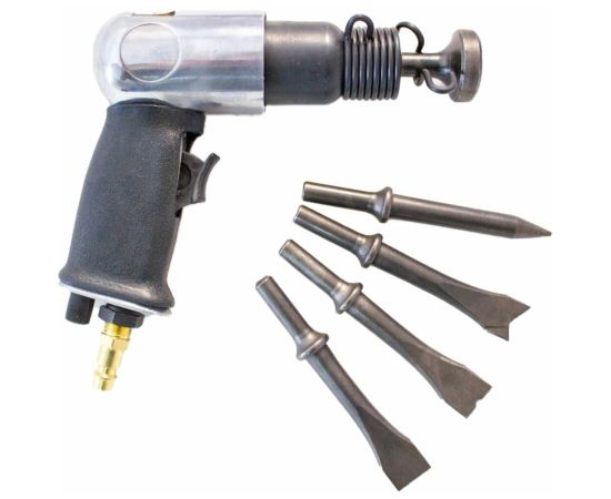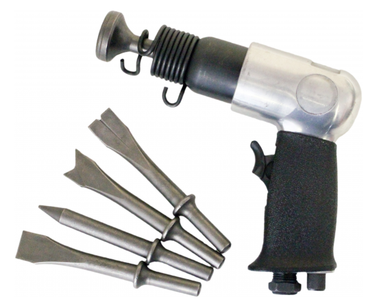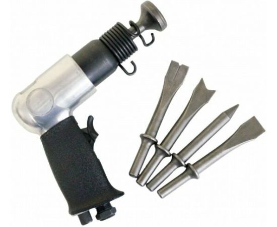 Изделие работает благодаря компрессору, который через шланг подает сжатый воздух в инструмент и приводит в действие ударный механизм.