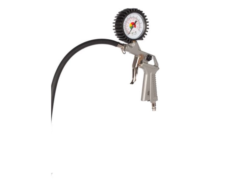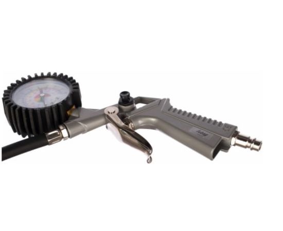 Пневмопистолет для накачки, с манометром. Незаменим в автомастерских, гаражах, на заправках. Оснащен манометром, необходимым для контроля давления, и гибким шлангом для присоединения к штуцеру шины.