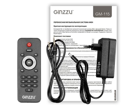 мидисистема, кабель аудио, адаптер GA-3048B для зарядки, пульт ДУ, краткая инструкция по эксплуатации и гарантийный талон