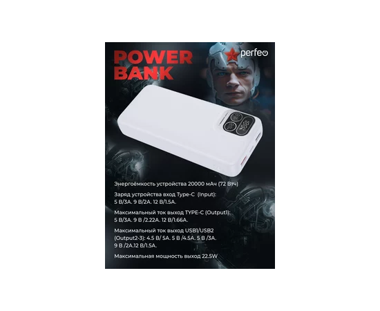 Повербанк Perfeo Atomic Age 20000 mAh/LED дисплей/PD + QC 3.0/Type-C/2 USB/Выход: 5A, max 22.5W/ Белый