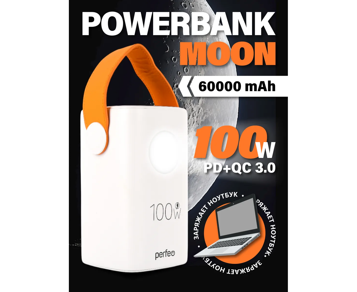Модель Perfeo Powerbank MOON 100W 60000 mAh/LED дисплей/PD+QC 3.0/2Type-C/3 USB/Выход:5A,max 100W