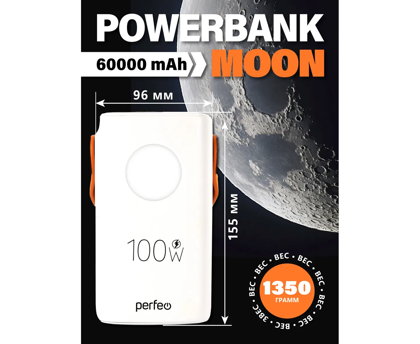 Powerbank Perfeo PF_E2293 Moon 100W 60000 mAh/LED дисплей/PD+QC 3.0/2Type-C/3 USB/max 100W/White