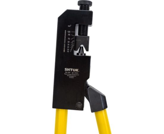 Ручные пресс-клещи SHTOK ПК-120У 03004 производят опрессовку медных и алюминиевых наконечников одним движением. Предназначены для использовании на производстве. Регулировка момента затяжки при помощи винта и шкалы под обжимаемый наконечник.
