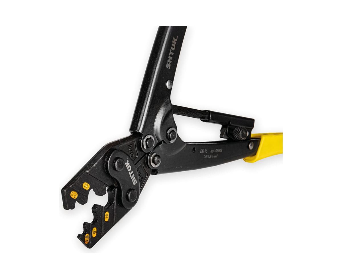 1.Особая конструкция ручных пресс-клещей SHTOK ПК-16 03008 плотно зажимает кабель, не давая ему "выйти" из рабочей области. Минимальная площадь опрессовки 1 мм.