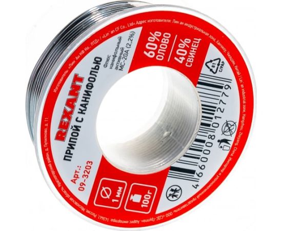 Припой с канифолью REXANT (09-3203) олово-60проц., свинец-40проц., 100гр, 1мм