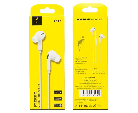 Проводные наушники с микрофоном внутриканальные SKYDOLPHIN SR17 Jack 3,5 (white) (206544)