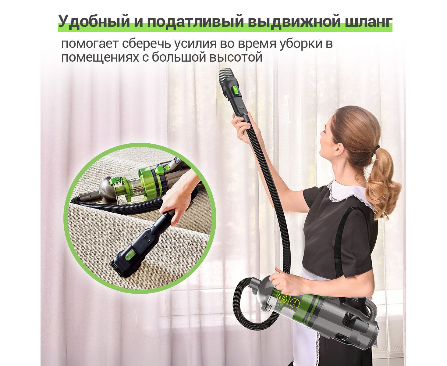Для удобства использования пылесос был изготовлен с учетом эргономичного дизайна и облегченной конструкции, вес и длина пылесборника могут поворачиваться на 360°, что позволяет не уставать даже во время длительной уборки.