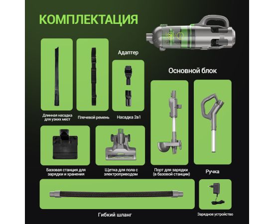 Большие колеса, Вертикальная парковка, Плечевой ремень, Подсветка зоны уборки, Регулировка мощности, Сбор золы, Съемный ручной пылесос