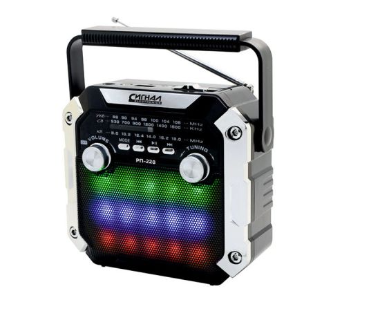 Очень сильный чистый звук, радиостанции ловит хорошо, светомузыка и фонарь работают.