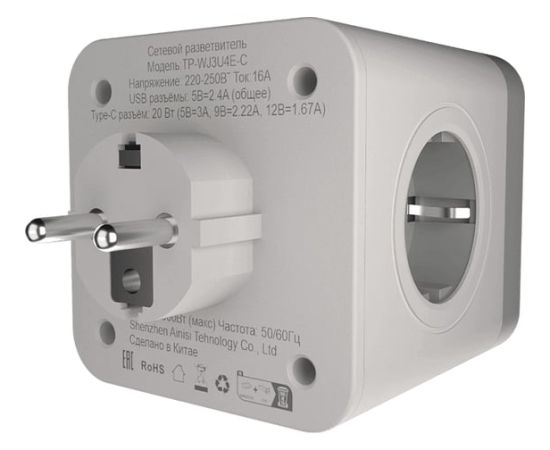 Разветвитель AGNI TP-WJ3U4E-C-white 4 розетки, 16А, 4000Вт, 220-250В, 2*USB, Type-C, белый