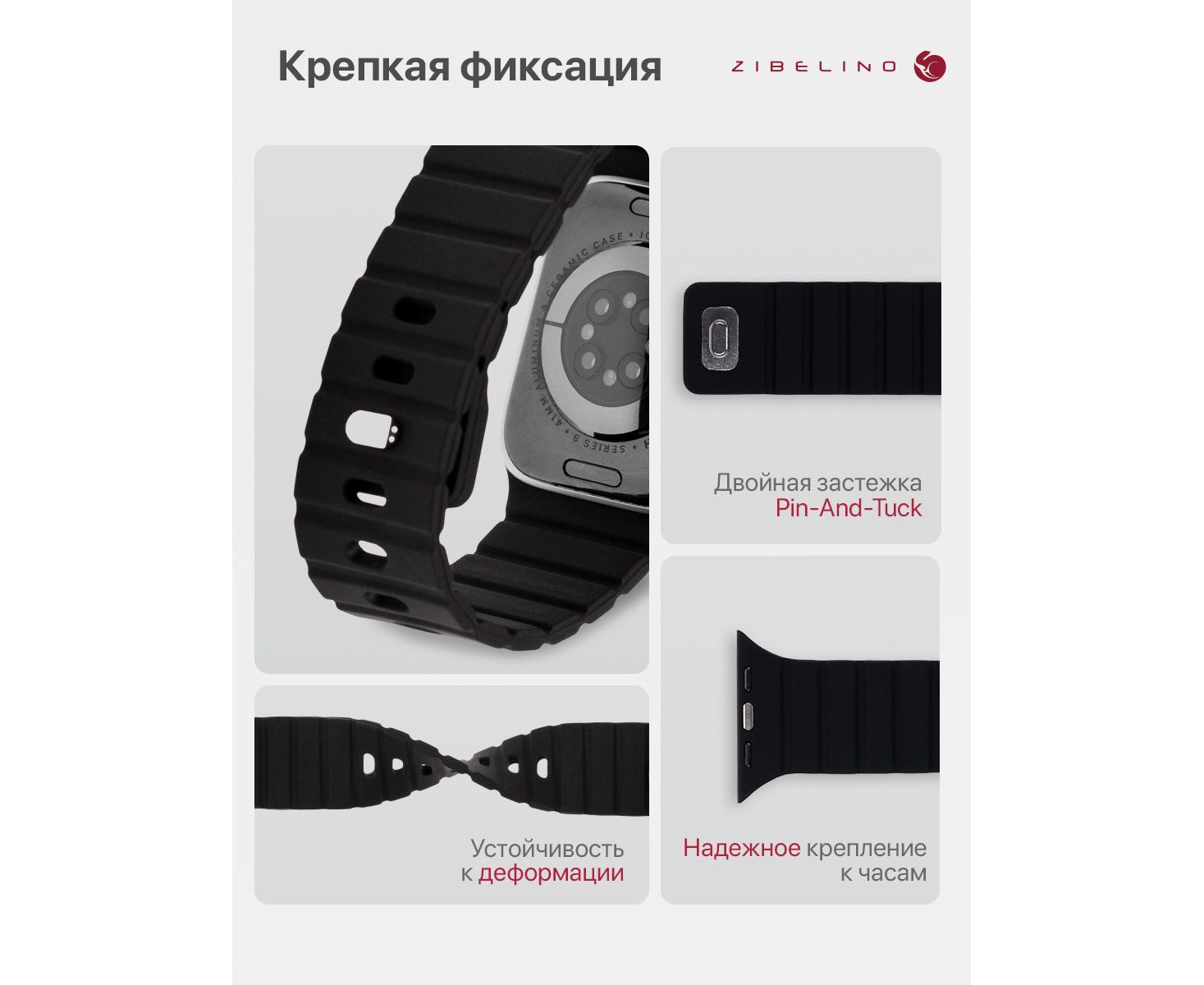 - Надежное крепление на руке: застежка pin-and-tuck (англ. «застежка-булавка») и магниты внутри ремня Эпл Вотч предотвращают расстегивание и обеспечивают идеальную посадку на запястье.
