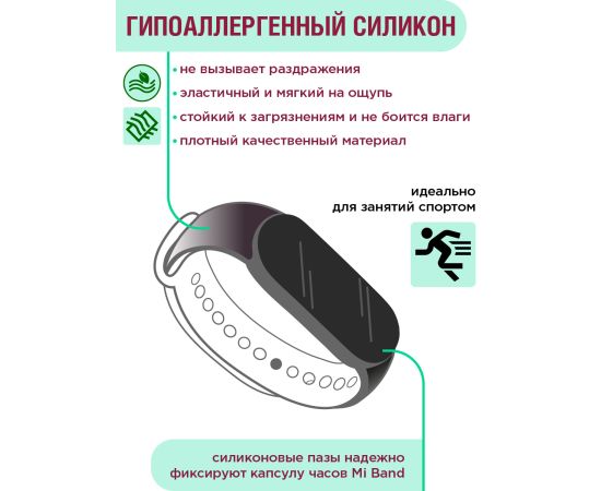 Универсальный и стильный ремешок для фитнес-браслета Xiaomi Mi Band 5, 6. Изготовлен из приятного на ощупь гипоаллергенного силикона. Надёжно крепится на фитнес браслет, исключая его выпадение, а также защищая от всевозможных повреждений. Длина ремешка регулируется от 16 до 20 см.